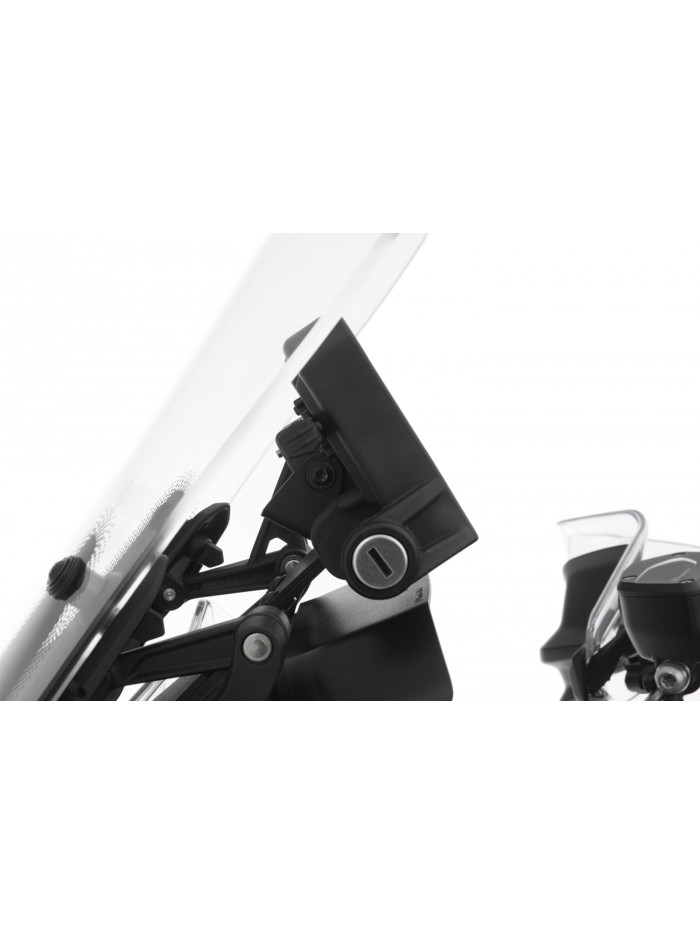 Il supporto originale del navigatore originale sull’attacco del manubrio sembra a prima vista molto pratico, ma diventa di ostacolo nel momento in cui si usa una borsa per serbatoio. Muovendo il manubrio il navigatore entra in collisione con la borsa limitando l’angolo di sterzo e di conseguenza il raggio di curva. Così sterzare diventa meno confortevole, più faticoso e più macchinoso di quanto dovrebbe. Il posizionamento relativamente basso costringe il conducente ad abbassare la testa per leggere o manovrare il navigatore, obbligando gli occhi a passare costantemente da oggetti distanti a oggetti ravvicinati. Uno sforzo che finisce per affaticarli. E anche l’aspetto relativo alla sicurezza non va sottovalutato, poiché il conducente è obbligato a distogliere continuamente lo sguardo dalla carreggiata. Il nostro supporto viene in vostro aiuto: colloca il navigatore nel campo visivo naturale, in posizione ottimale anche per i comandi, consentendo una guida rilassata. Questa posizione è sopra lo strumento combinato TFT. Così il conducente ha sempre in vista la carreggiata e il navigatore. Questa disposizione si è dimostrata valida e garantisce un comfort nettamente maggiore per la guida, la navigazione e il comando, evitando un affaticamento precoce e aumentando la sicurezza in strada. Si fissa con grande semplicità al supporto del cupolino. L’attacco per strumenti può essere posizionato individualmente ed è composto da acciaio inox verniciato a polvere nera.