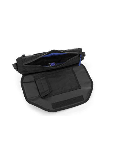 La borsa sportiva multifunzionale e compatta si fissa in tutta facilità sulla copertura della sella del passeggero. È perfetta quando c’è bisogno di fare rapidamente spazio. Il nuovo design, funzionale e semplificato, della nostra borsa per sella e portapacchi, è riconoscibile dalle discrete finiture blu. Dispone di un volume di 14 litri, ampliabile se necessario a 20 litri. Sul lato sono presenti altre due pratiche tasche. La base della borsa è indeformabile. La borsa si richiude con una cerniera impermeabile e antipolvere. In questo modo, la borsa tiene saldamente fermi i bagagli proteggendoli, e non sbatte di qua e di là. Per questo, anche ad alte velocità, non produce rumori. Il coperchio sul lato superiore dispone di un versatile sistema di supporto simile al sistema militare MOLLE, che consiste in aperture ovali poste a distanza regolare, a ciascuna delle quali è possibile agganciare facilmente borse aggiuntive. La rete regolabile, realizzata con un elastico a zig-zag, serve a trattenere rapidamente guanti, ecc. Per il trasporto abbiamo previsto una comoda maniglia antiscivolo.