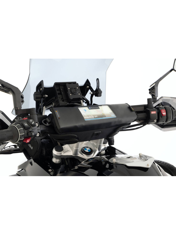 Per tutto cio' che deve essere a portata di mano ma anche ben protetto Adesso con pratica finestra per il facile utilizzo di apparecchi multimediali. Funzionali borse per manubrio concepite specialmente per modelli BMW. Solo cosi' si puo' utilizzare al meglio lo spazio che si ha a disposizione. Alette facili da aprire, nelle quali e' gia' previsto uno scomparto supplementare ed ulteriori alloggiamenti per penne, carte di credito ecc. Lo scomparto principale e' chiuso da una cerniera idrorepellente e resistente allo sporco. Per permettere il ricarico di cellulari ecc. anche in viaggio, la borsa dispone di un'accesso E-Connect (accesso cavo idrorepellente). Per garantire stabilita' in ogni condizione sono presenti dei rinforzi, un'imbottitura assorbi vibrazioni e l'accurata lavorazione a due o tre strati. Questa borsa è un’evoluzione della nostra precedente borsa da manubrio, molto migliorata in termini di impermeabilità. Abbiamo sostituito la parte superiore e tutta la patta con un telone da camion impermeabile e saldato lo scomparto per cellulare. Così il cellulare è perfettamente protetto. Facile da montare/smontare Tenuta sicura in ogni condizione Innesto-Media per apparecchi con versione L fino a ca. 130 x 70 x 10 mm (altezza x larghezza x lunghezza) – per es.: iPhone 5/6, Samsung S 5/6 ecc. Grazie alla tecnica di attacco e’ anche adatta per apparecchi piu’ piccoli. L’apparecchio resta utilizzabile Passacavo protetto dall’acqua Supporto supplementare e tasca nell’aletta interna Con forma stabile anche vuota Attacco veloce al manubrio Cerniera idrorepellente all’acqua e alla polvere Imbottita e con rivestimento interno Cinghia per trasporto Tessuto Cordura idrorepellente, impregnato con Fluorcarbon.