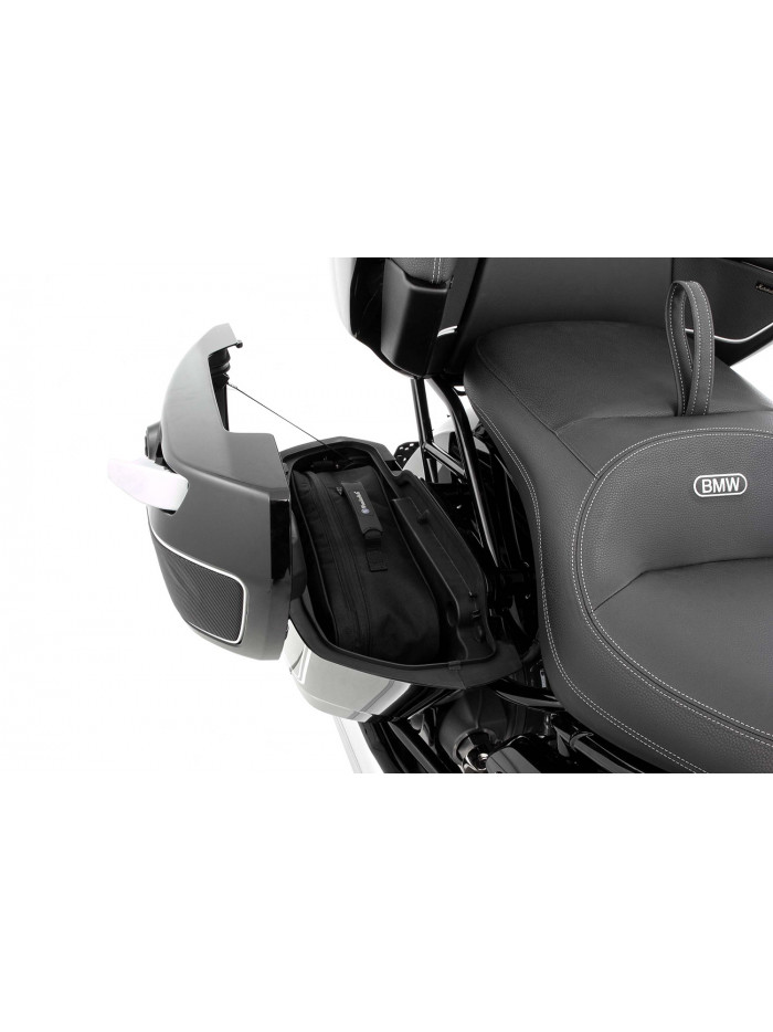 Le nostre robuste borse interne realizzate su misura in CORDURA® nero sono perfettamente rifinite e non lasciano nulla a desiderare: dotate di fodera interna blu, tracolla regolabile e pratica maniglia per il trasporto ergonomica, queste borse sono ben realizzate e possono anche essere utilizzate come comode borse da viaggio. Dotato di una spaziosa tasca interna richiudibile con cerniera. Esclusiva borsa interna per valigie per valigie originali BMW e valigie con geometria simile.