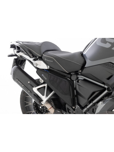 Le due pratiche borse in CORDURA® TrueLock™ perfettamente lavorato offrono spazio aggiuntivo per tutto ciò che deve essere a portata di mano, ad esempio strumenti o accessori sociali. Al contempo chiudono le aperture a destra e sinistra del posteriore completando il design GS, come fondendosi in un’unica entità con la moto oltre a proteggere conducente e passeggero dagli schizzi d’acqua. Per uno stile di guida neutrale vanno idealmente applicate nei pressi del baricentro. Ancor più importante nella guida fuori strada. Non ostacolano la libertà di movimento di conducente e passeggero.