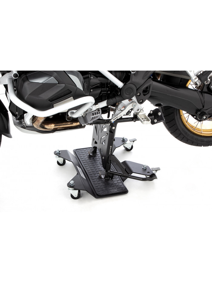 L'assicurazione sulla vita per la vostra BMW R 1300 GS: la superficie limitata del cavalletto laterale originale comporta il rischio di un lento e spesso impercettibile affondamento della moto sia sul catrame caldo sia su fondo leggermente ammorbidito. Una piastra di estensione precisamente formata, facilmente avvitabile al cavalletto, compensa efficacemente questa carenza strutturale. E affinché il cavalletto possa essere piegato comodamente con il tacco dello stivale, abbiamo predisposto una dentatura esterna.