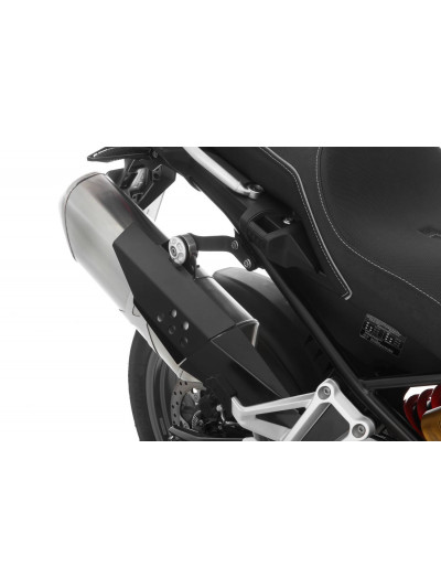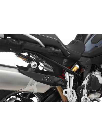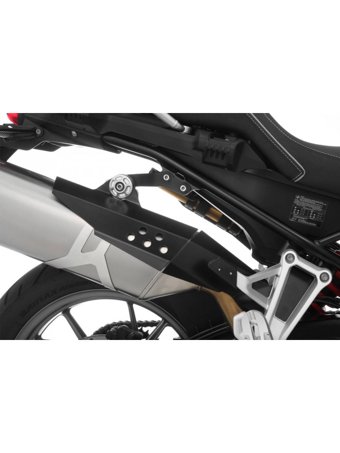 Protezione termica e meccanica che scherma efficacemente il calore della parte anteriore del silenziatore ed evita il contatto con lo scarico rovente sui punti nevralgici. In questo modo, lo scudo protegge da dolorose ustioni ed evita eventuali danni ai bagagli dovuti agli influssi termici. Al contempo offre protezione dal calore e un’elevata protezione meccanica del silenziatore da graffi o ammaccature, che si possono verificare facilmente viaggiando fuori strada o nello sventurato caso di un incidente. La stabilità strutturale di questo accessorio durevole si deve al fissaggio a più punti e alla rigidità dell'acciaio inox, precisamente smussato, parzialmente traforato e verniciato a polvere nera. Design sportivo integrato che si inserisce nel layout della GS. Il montaggio è molto semplice e preciso con l’apposito kit fornito. A tal fine si utilizzano i raccordi a vite originali.