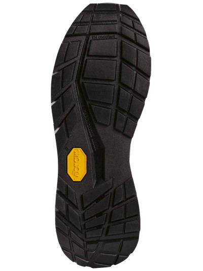 Una suola outdoor Vibram di altissima qualità in combinazione con una suola in EVA bicomponente resistente all'olio e al carburante di spessori diversi nelle varie zone contrassegnati con colori