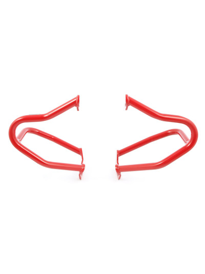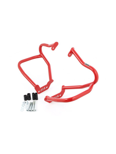 Le staffe di rinforzo si adattano perfettamente e correggono efficacemente le debolezze dei due fianchi aperti della barra di protezione motore di serie. Offrono una sicurezza passiva significativamente maggiore.